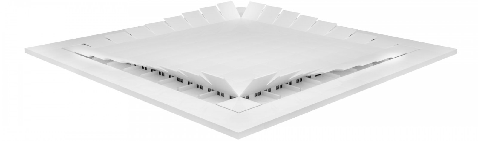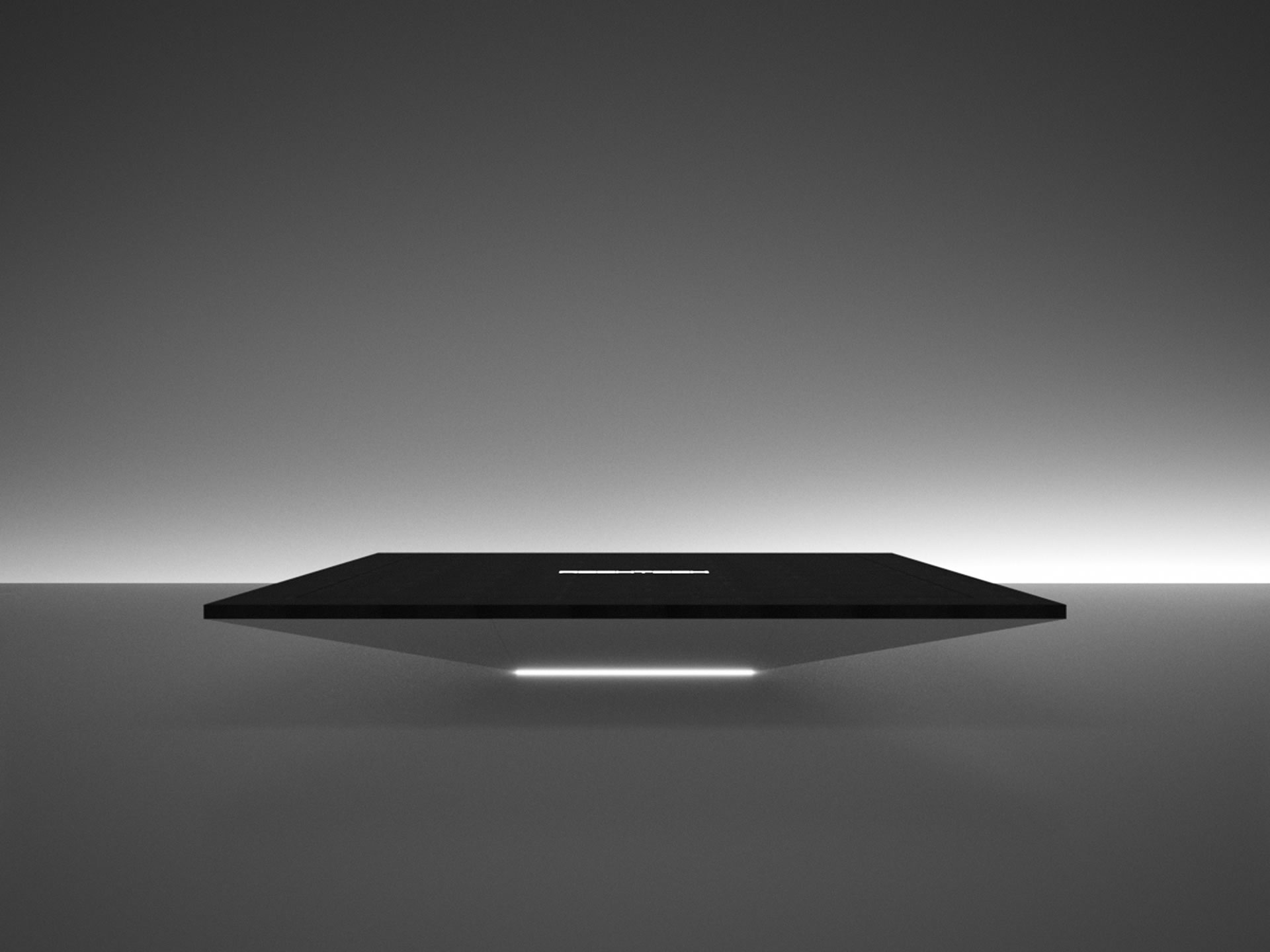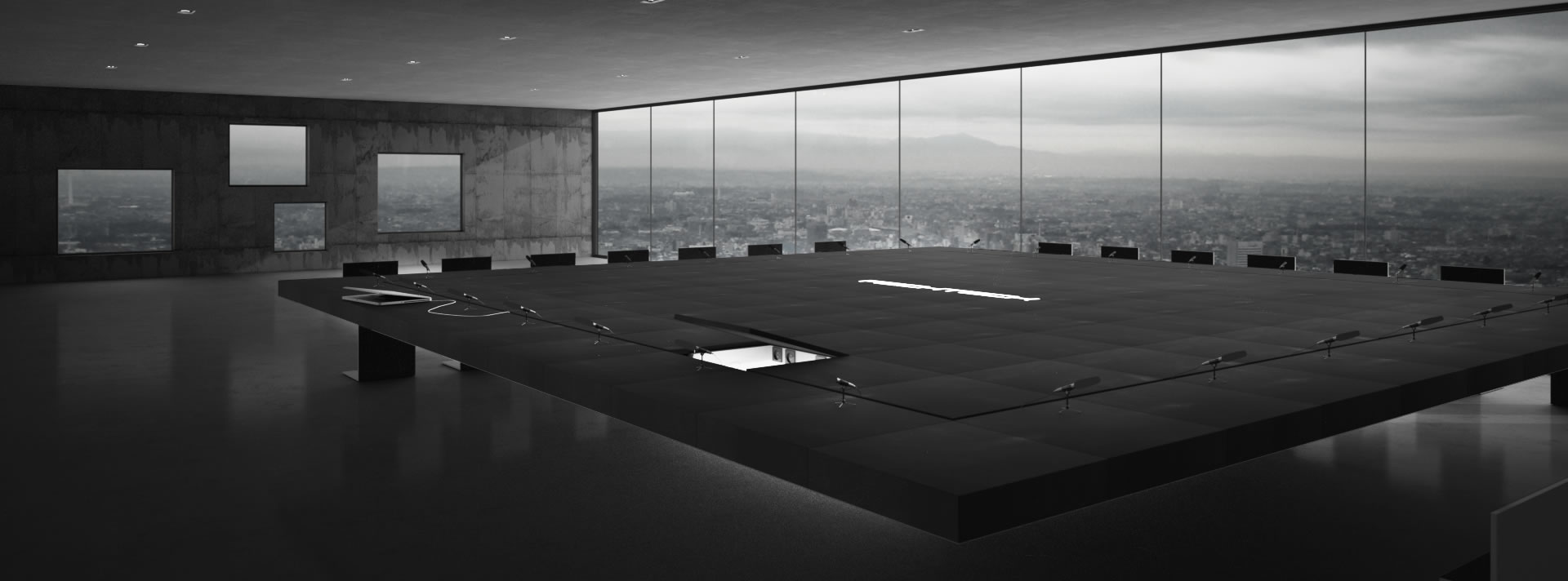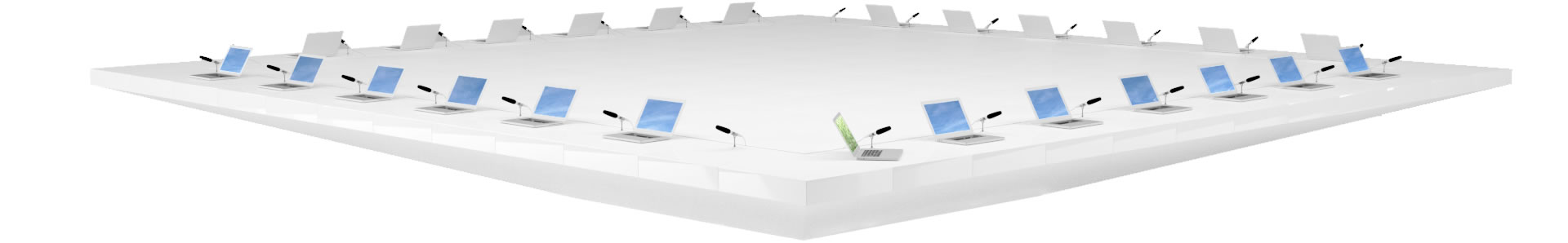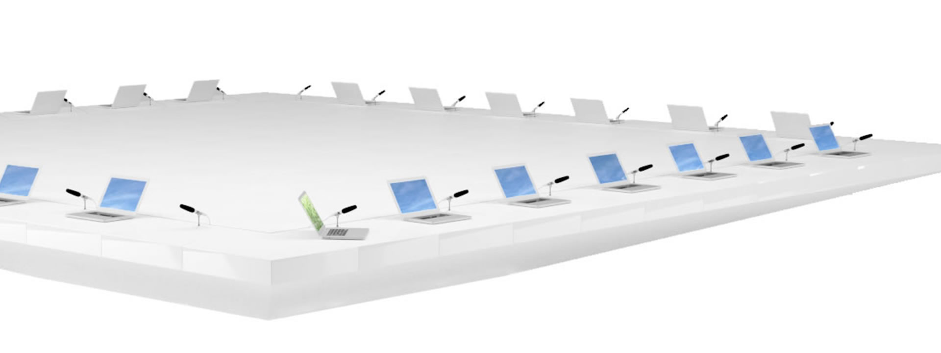 Die Technische Innovation steckt in der Tischplatte. Diese durch den Keilförmig zurückgesetzten Fuß schwebend wirkende Tisch-Scheibe lässt sich als 6.00m x 6.00m Riesen LED Display mit Touchscreen bestellen. So lassen sich die Präsentationsinhalte von der Wand auf die Tischplatte holen und die Informationen per Fingerwisch zu den einzelnen Teilnehmern rüberschnipsen.